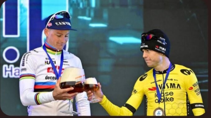 Het was zo’n moment waar wielerfans alleen maar van kunnen dromen—twee van de felste rivalen in de sport, naast elkaar op het podium, medailles om de nek, enorme glazen Belgisch bier in de hand en een vleugje ondeugende glimlach in hun ogen. Afgelopen zondag leverden de huldiging en viering na de laatste Europese veldritwedstrijd tussen Mathieu van der Poel en Wout van Aert een perfecte mix van competitie, kameraadschap en typisch Belgische cultuur op.