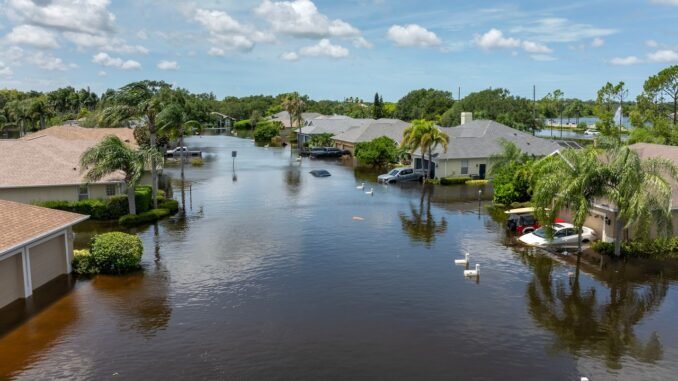 Flooded houses from hurricane Debby rainfall water in Laurel Meadows community in Sarasota, Florida. Aftermath of natural disaster in USA south.