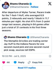 The trade comes following the Pacers’ decision to move on from longtime center Myles Turner, creating a spot for Huff.