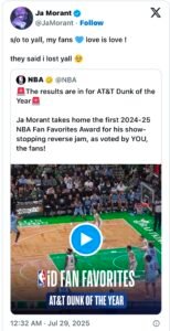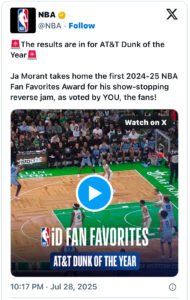 Ja Morant takes home the first 2024-25 NBA Fan Favorites Award for his show-stopping reverse jam, as voted by YOU, the fans!”