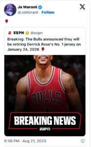 Ja Morant, a guard for the Memphis Grizzlies, was among the many current and former NBA players that celebrated over Rose’s jersey retirement announcement.