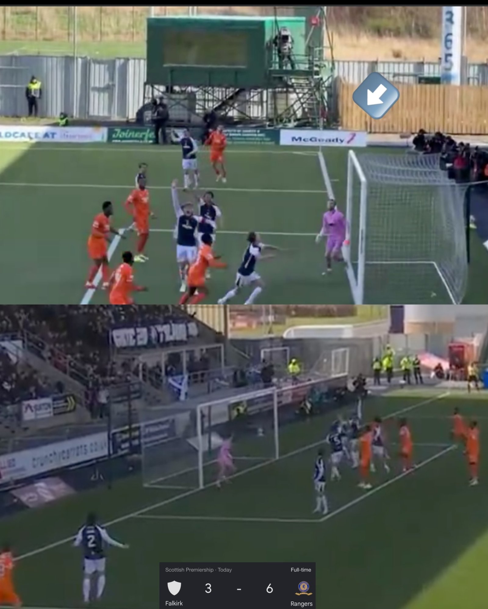 A reverse-angle clip of Rangers F.C.’s opening goal appears to support the referee’s decision to allow it to stand. The incident was reviewed by VAR after strong protests from Falkirk players, who appealed to referee Don Robertsonfollowing the goal.
