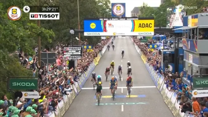 De jonge Brit deed dit met overtuiging: hij snelde naar zijn tweede zege in deze Deutschland Tour, met enkele fietslengtes voorsprong op sprinters als Sam Welsford en Phil Bauhaus.